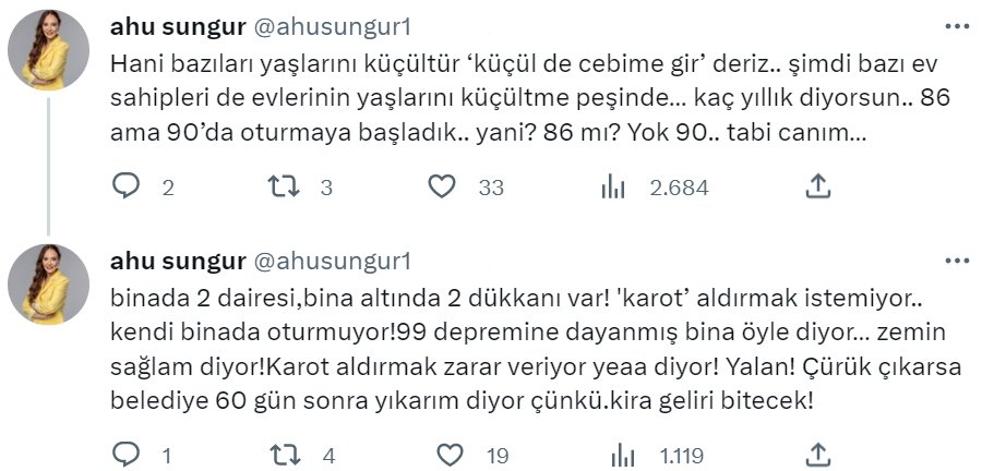 Oyuncu Ahu Sungur, olası İstanbul depremi için evinde hasar tespiti yaptırmak istemeyenlere tepki gösterdi. Ev sahiplerinin bina yaşını küçültmeye çalıştıklarını söyleyen Sungur, "Binada dairesi olan ancak oturmayan ev sahipleri karot aldırmak istemiyor. Çünkü çürük çıkarsa kira geliri bitecek!" dedi.