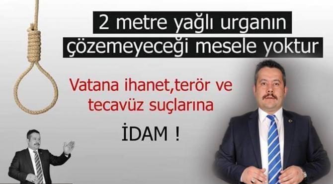 AK Parti Uşak Merkez İlçe Başkanı Turgay Eser, Facebook'ta yayınladığı paylaşımda idamı gündeme getirdi. Son günlerdeki terör, vatana ihanet ve tecavüz suçlarına dikkat çeken Eser'in paylaşımı çok sayıda takipçisi tarafından beğenildi, yorumlar yapıldı. Eser, kendi ları ve bir idam ipinin yer aldığı resimli paylaşımında  "2 metre yağlı urganın çözemeyeceği mesele yoktur. Vatana ihanet, terör ve tecavüz suçlarına İdam!" diye yazdı.