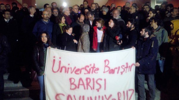 Kocaeli Üniversitesi'nde 'Barış için Akademisyenler İnisiyafiti'nin bildirisine imza atan; Araştırma görevlisi Adem Yeşilyurt, Doç.Dr. Aynur Özuğurlu, Doç. Dr. Burcu Yakut Çakar, Yrd. Doç. Dr.Derya Keskin, Doç. Dr. Gül Köksal, Doç. Dr. Güven Bakırezer, Doç.Dr. Hakan Koçak, Yrd. Doç. Dr. Hülya Kendir, Prof.Dr. Kuvvet Lordoğlu, Prof.Dr. Mehmet Cengiz Erçin, Yrd. Doç. Dr. Mehmet Rauf Kesici, Yrd. Doç. Mehmet Ruhi Demiray, Prof. Dr. Nilay Etiler, Prof. Dr. Onur Hamzaoğlu, Doç.Dr. Özlem Özkan, Prof. Dr. Ümit Biçer, Prof. Dr. Veli Deniz, Doç.Dr. Yücel Demirer ve Prof.Dr. Zelal Ekinci dün düzenlenen operasyonla gözaltın alındı. Daha sonra adliyeye sevk edilen Kocaeli Üniversitesi'nde görevli 19 akademisyen gece saatlerinde serbest bırakıldı. Akademisyenler, çıkışta büyük sevinç yaşadı. Akademisyenler adına ortak açıklamayı, Kocaeli Üniversitesi Halk Sağlığı Ana Bilim Dalı Başkanı Prof. Dr. Onur Hamzaoğlu yaptı.