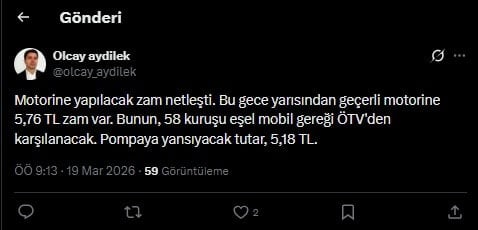 Gazeteci Olcay Aydilek’in aktardığı verilere göre motorine 5,18, TL'lik zam netleşti. Dilek paylaşımında şu ifadeleri kullandı