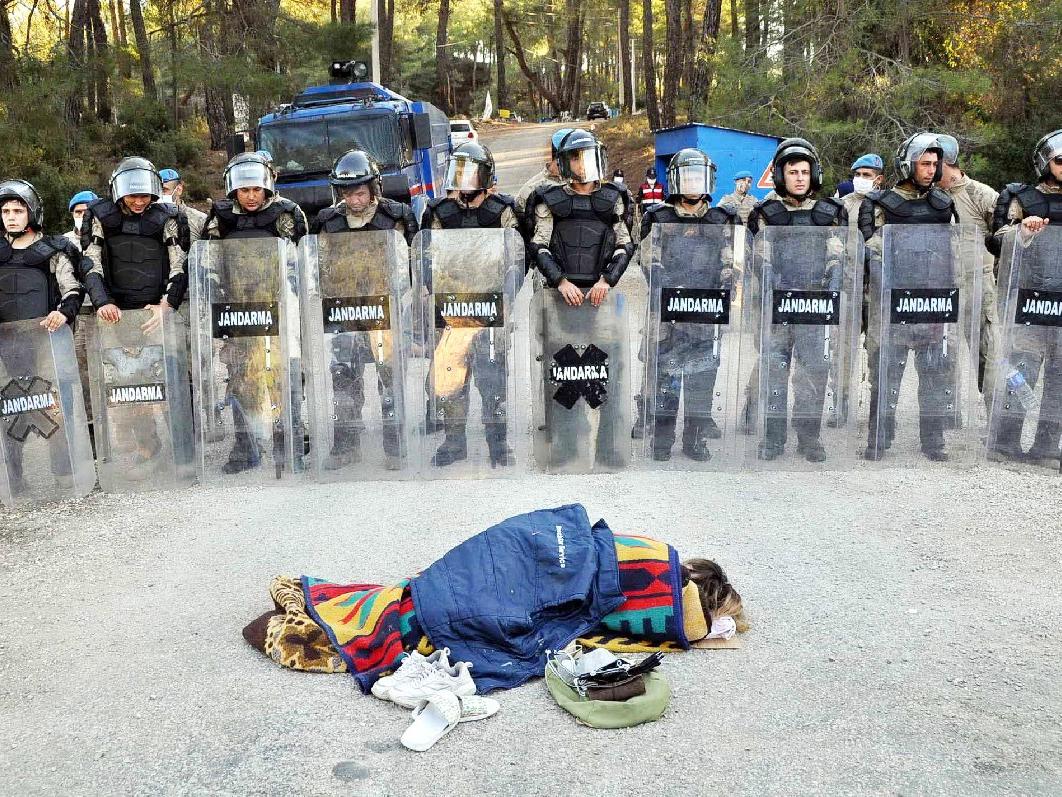 Akbelen ormanlarındaki nröbet çadırına müdahale edilmesinin ardından İkizköylü kadınlar bu sabahı jandarma bariyerinin önüne yatarak geçirdi. Bölgeden ayrılmayan köylüler ve çevrecilerin İkizköy'e geçişine de izin verilmedi.