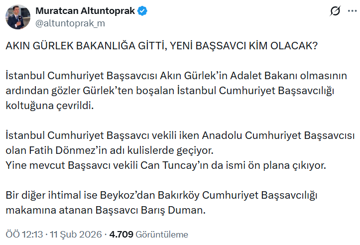 Sözcü TV İstihbarat Şefi Muratcan Altuntoprak'ın aktardığı bilgilere göre, Gürlek'in Adalet Bakanı olmasının ardından gözler Gürlek’ten boşalan İstanbul Cumhuriyet Başsavcılığı koltuğuna çevrildi.