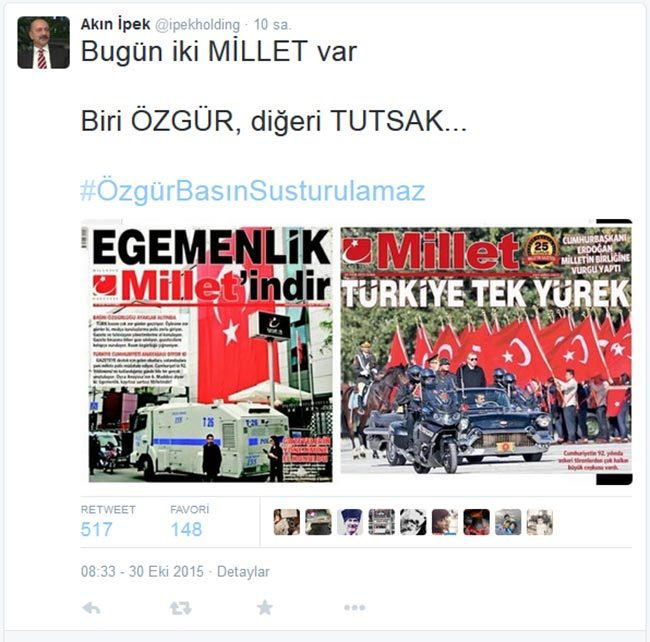 Koza İpek Grubu bünyesindeki Kanaltürk, Bugün TV, Bugün Gazetesi ve Millet Gazetesi'ne kayyum getirilmesinin yankıları devam ederken, İpek Holding Yönetim Kurulu Başkanı Akın İpek sosyal medya hesabında bir paylaşımda bulundu.