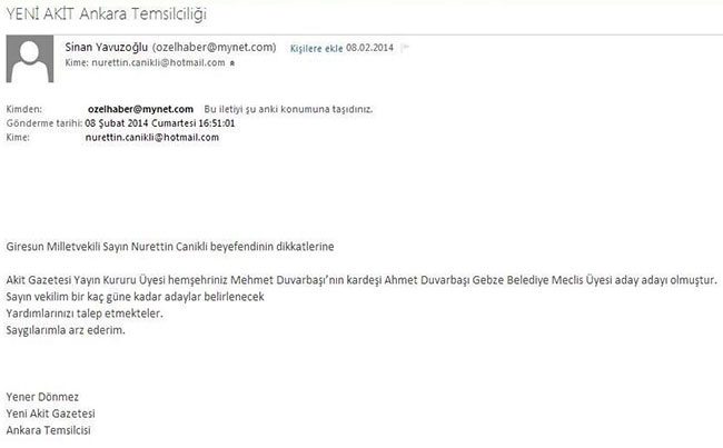 Odatv'nin haberine göre, Redhack'in yayınladığı maillerden en dikkat çekeni; Akit'in Ankara Temsilcisi Yener Dönmez'in Canikli'ye attığı ve gazetesinin yayın kurulu üyesi Mehmet Duvarbaşı'nın kardeşi Ahmet Duvarbaşı'nın AKP'den Gebze Belediye Meclis Üyesi adaylığı konusunda yardım talebinin bulunduğu mail.