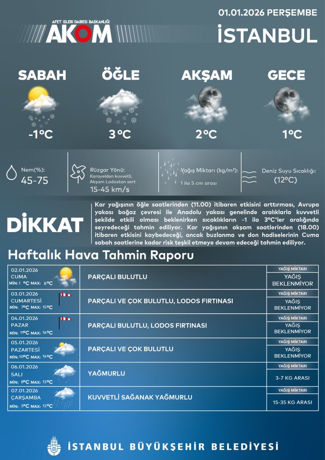 AKOM verilerine göre, Avrupa Yakası’nda İstanbul Boğazı çevresi ile Anadolu Yakası genelinde aralıklarla kuvvetli şekilde görülen kar yağışının saat 18.00 itibarıyla zayıflaması öngörülüyor. Hava sıcaklıklarının ise gece boyunca -1 ile 3 derece arasında seyredeceği tahmin ediliyor.