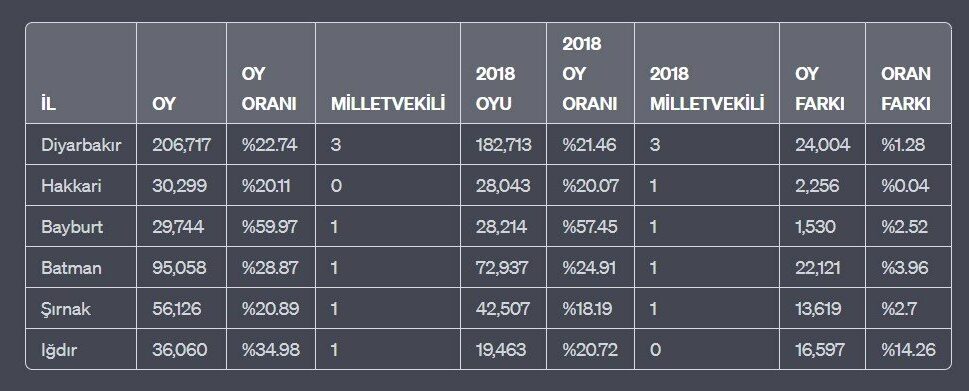 AKP diğer seçim bölgelerinde 2018 yılına göre oy kaybederken, İstanbul'da yüzde 42.69'dan yüzde 35.88'e, Ankara'da yüzde 40.44'den yüzde 32.28'e, İzmir'de ise yüzde 28.7'den 24.88'e geriledi.