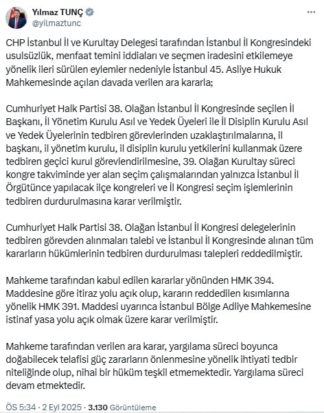 "CHP İstanbul İl ve Kurultay Delegesi tarafından İstanbul İl Kongresindeki usulsüzlük, menfaat temini iddiaları ve seçmen iradesini etkilemeye yönelik ileri sürülen eylemler nedeniyle İstanbul 45. Asliye Hukuk Mahkemesinde açılan davada verilen ara kararla;
