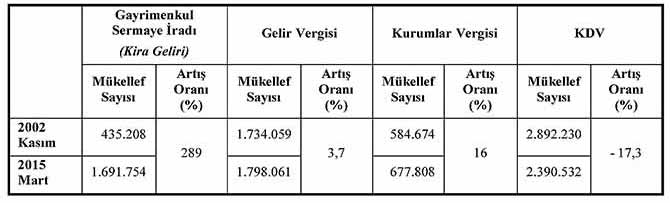 Kira geliri elde edip bunu beyan eden mükellef sayısı “2002 Kasım ayında 435 bin” kişi iken, bu rakam “2015 Mart sonunda yüzde 289 artış ile 1 milyon 691 bin kişiye ulaşmış durumda.