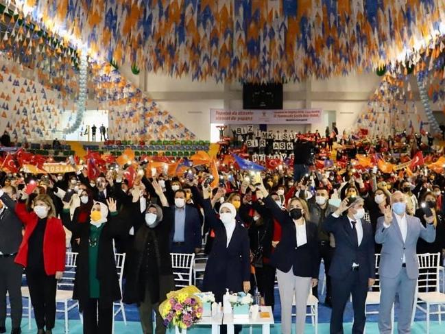 Sosyal mesafe kuralının hiçe sayıldığının gözlendiği AKP Mersin İl Kadın Kolları’nın 6’ncı Olağan Kongresi’nde ellerindeki parti bayrağı ve flamalarını sallayan partililer, milletvekilleri ve davetliler merhum sanatçı Kayahan’ın Bizimkisi bir aşk hikayesi parçasını hep bir ağızdan seslendirdi.