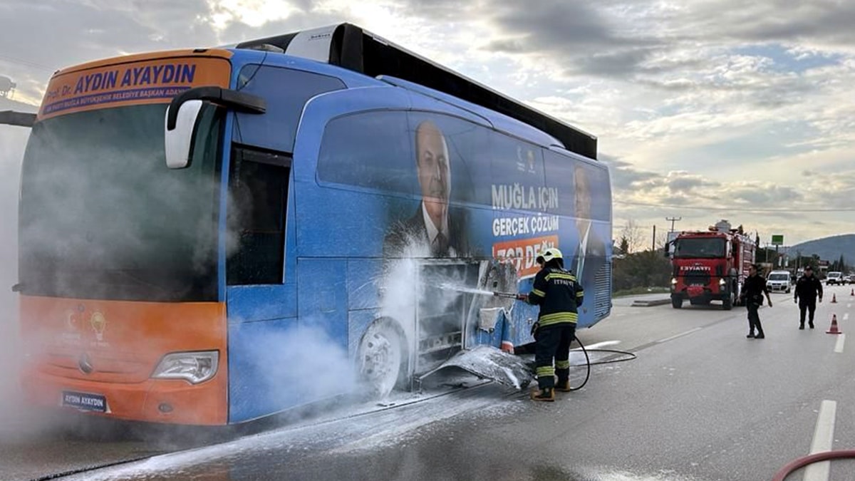 AKP'li Muğla Büyükşehir Belediye Başkan Adayı Aydın Ayaydın Fethiye’de yaptığı bir dizi ziyaretin ardından Seydikemer ilçesine otobüs ile harekete geçti. Seçim şarkıları eşliğinde seyir halinde olan seçim otobüsü Zorlar Mevkii’nde bilinmeyen bir nedenle alev aldı. İhbar üzerin olay yerine itfaiye ekipleri sevk edildi.
