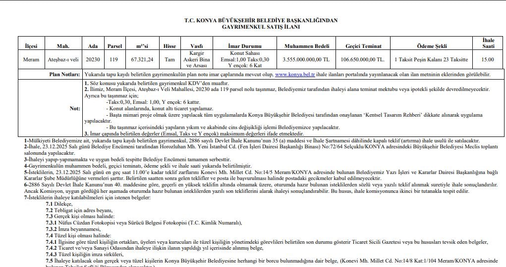 AKP’li Belediye şimdi de eski askeri arazinin 67 bin 321 metrekarelik alanını da satmaya hazırlanıyor. Konya Büyükşehir Belediyesi’nin resmi sitesinde yer alan bilgilere göre; söz konusu arazi için belirlenen muhammen bedel 3 milyar 555 milyon TL. Konut yapımı için satılacak olan araziye en çok 6 kat imar verildiği belirtilirken, haleye geçici 106 milyon 650 bin TL verilecek. Ödeme şekli 1 taksit peşin, kalanı 23 taksit şeklinde olacak. Dev satışın ihalesi, 23 Aralık 2025 tarihinde saat 15.00’te Horozluhan Mahallesi, Yeni İstanbul Caddesi (Fen İşleri Dairesi Başkanlığı Binası) No:72/64 Selçuklu/KONYA adresindeki Büyükşehir Belediyesi Meclis toplantı salonunda yapılacak.