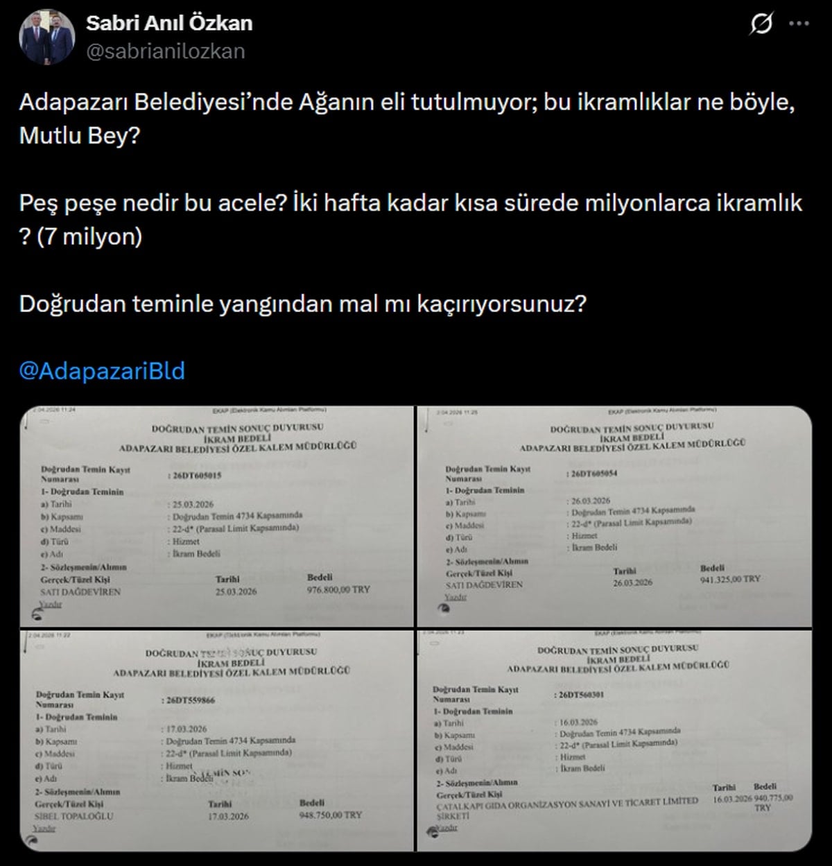 CHP Adapazarı İlçe Başkanı Sabri Anıl Özkan tarafından paylaşılan belgelere göre, belediye bütçesinden “ikram bedeli” kalemi altında toplamda milyonlarca lirayı bulan dört ayrı ödeme yapıldığı öne sürüldü.