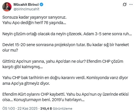 AKP'li Mücahit Birinci sosyal medya hesabından yaptığı açıklamada dikkat çeken ifadeler kullandı. Teröristbaşı Öcalan'ın yaşlandığı ve Kürtlerde bir karşılığı olmadığını iddia eden Birinci CHP'nin oy kaybedeceği yorumlarının gerçek dışı olduğunu söyledi.