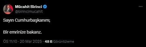 Birinci sosyal medya hesabından yaptığı paylaşımda şu ifadeleri kullandı: