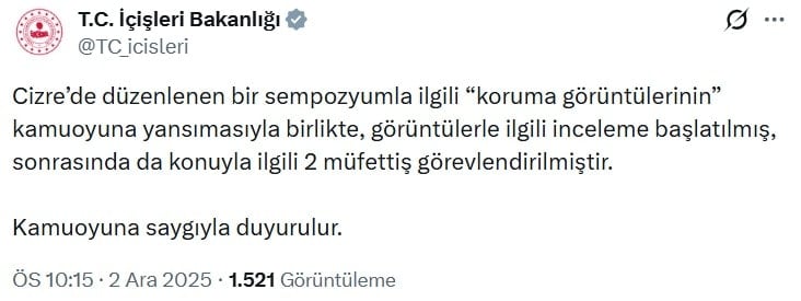 "Cizre’de düzenlenen bir sempozyumla ilgili “koruma görüntülerinin” kamuoyuna yansımasıyla birlikte, görüntülerle ilgili inceleme başlatılmış, sonrasında da konuyla ilgili 2 müfettiş görevlendirilmiştir.
