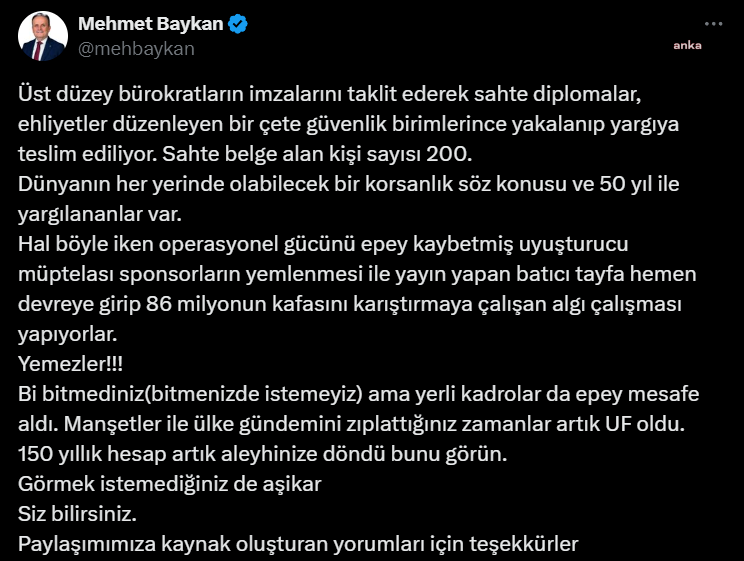 “Üst düzey bürokratların imzalarını taklit ederek sahte diplomalar, ehliyetler düzenleyen bir çete güvenlik birimlerince yakalanıp yargıya teslim ediliyor. Sahte belge alan kişi sayısı 200. Dünyanın her yerinde olabilecek bir korsanlık söz konusu ve 50 yıl ile yargılananlar var. Hal böyleyken operasyonel gücünü epey kaybetmiş uyuşturucu müptelası sponsorların yemlenmesi ile yayın yapan batıcı tayfa hemen devreye girip 86 milyonun kafasını karıştırmaya çalışan algı çalışması yapıyorlar. Yemezler. Bi bitmediniz (bitmenizi de istemeyiz) ama yerli kadrolar da epey mesafe aldı. Manşetler ile ülke gündemini zıplattığınız zamanlar artık uf oldu. 150 yıllık hesap artık aleyhinize döndü, bunu görün. Görmek istemediğiniz de aşikar. Siz bilirsiniz.”