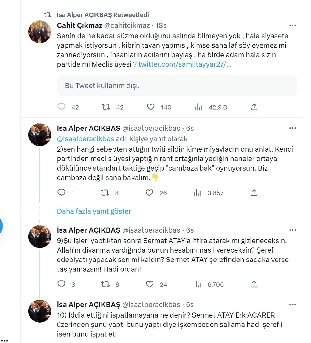 Çıkmaz’dan sonra bu defa MHP’li vekilin Meclis Danışmanı İsa Alper Açıkbaş, Tayyar’a sert ifadelere içeren açıklamalar yaptı. Tayyar, kendi attığı mesajları tek tek sildi.