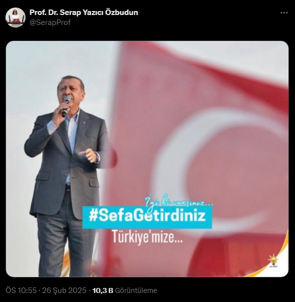 Gelecek Partisi’nden ayrılarak AKP’ye katılan Prof. Dr. Serap Yazıcı Özbudun, Cumhurbaşkanı ve AKP Genel Başkanı Recep Tayyip Erdoğan’ın doğum gününü övgü dolu sözlerle kutladı.
