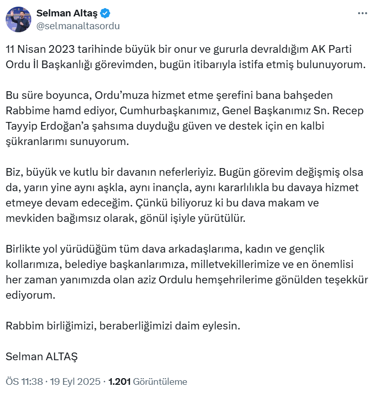 "11 Nisan 2023 tarihinde büyük bir onur ve gururla devraldığım AK Parti Ordu İl Başkanlığı görevimden, bugün itibarıyla istifa etmiş bulunuyorum.