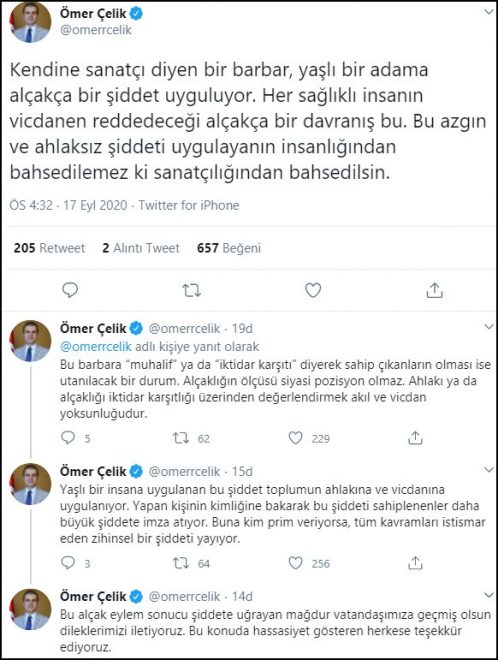 AKP Sözcüsü Ömer Çelik, 67 yaşındaki komşusu Hüseyin Meriç'i darbeden şarkıcı Halil Sezai ile ilgili sosyal medya hesabından açıklamalarda bulundu. Çelik, "Kendine sanatçı diyen bir barbar, yaşlı bir adama alçakça bir şiddet uyguluyor. Her sağlıklı insanın vicdanen reddedeceği alçakça bir davranış bu" dedi.