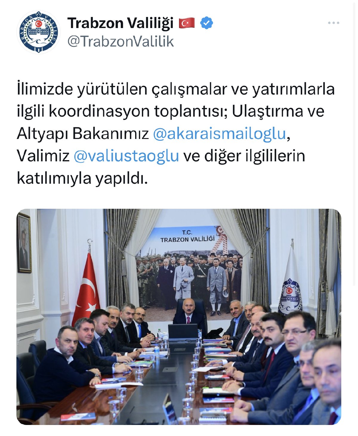 Bakan Karaismailoğlu’nu havalimanında karşılayan Trabzon Valisi İsmail Ustaoğlu, bu fotoğrafı ve koordinasyon toplantısını Trabzon Valiliği’nin resmi internet sitesinden yayınlandı. Karşılamaya AKP'liler de katılıp Karaismailoğlu lehine sloganlar attı.