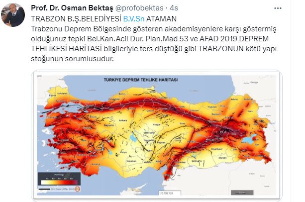 Bektaş, “Trabzon Büyükşehir Belediye Başkanvekili Sayın Ataman’ın Trabzon’u deprem bölgesinde gösteren akademisyenlere karşı göstermiş oldu tepki, Bel Kan. Acil. Dur. Plan. Mad 53 ve AFAD 2019 Deprem Tehlikesi haritası bilgileriyle ters düştüğü gibi Trabzon’un kötü yapı stokunun sorumlusudur” ifadelerini kullanarak Türkiye’nin deprem haritasını yayınladı.