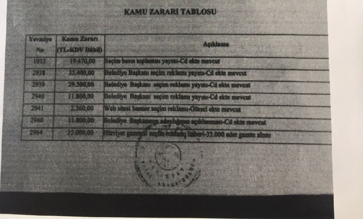 "Söz konusu ödeme emri ve eki belgelerde Belediye Başkanın imzası, parafı veya oluru bulunmasa da, Belediye Başkanı olarak kendi isminin geçtiği bu tür ilan ve tanıtım giderlerinden haberinin, onay ve talimatının olmaması düşünülemez. Belediye Başkanı ile ödeme emri evraklarında imzası bulunan Harcama Yetkilisi ve Gerçekleştirme Görevlisinin sorumluluğu bulunmaktadır. Bu itibarla, 2019 yılında Belediye bütçesinden yapılan ve muhteviyatı itibariyle Mahalli İdare Seçimlerinde Belediye Başkanının seçim kampanyasına yönelik ilan, reklam ve tanıtım giderleri niteliğindeki ödemelerin Belediye bütçesinden karşılanması sonucu toplam 1 milyon 971 bin 598 lira 10 kuruş kamu zararı oluşmuştur."