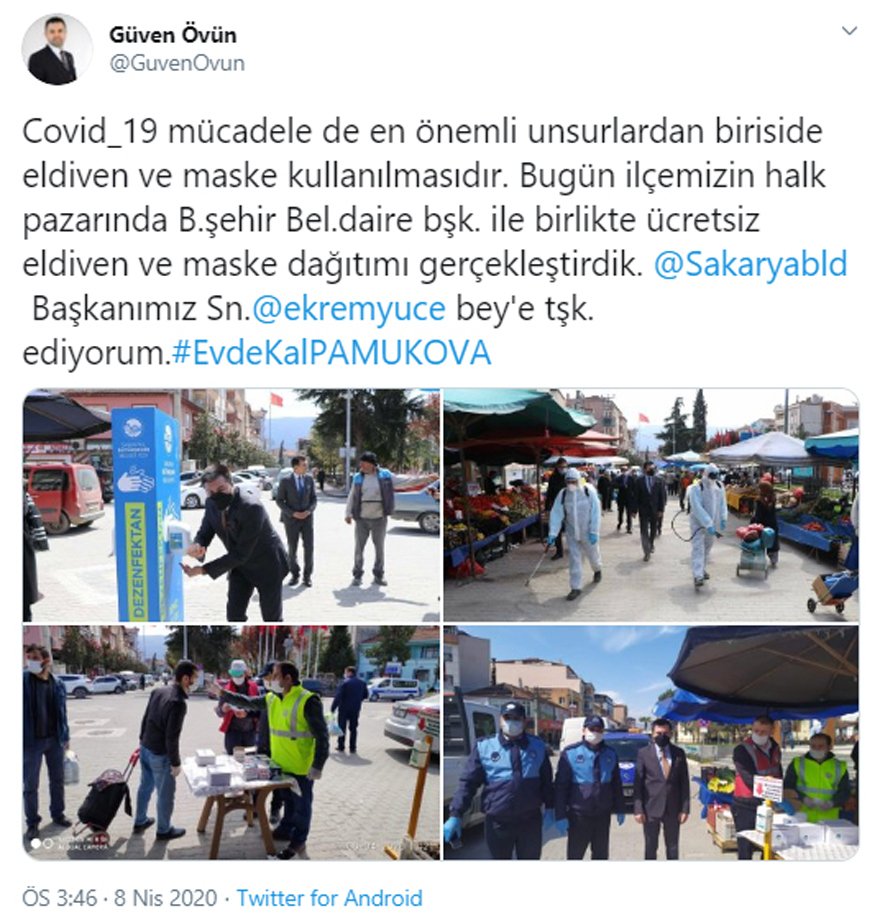 Övün yaptığı paylaşımda, "Covid-19 mücadele de en önemli unsurlardan biriside eldiven ve maske kullanılmasıdır. Bugün ilçemizin halk pazarında B.şehir Belediye Daire başkanı ile birlikte ücretsiz eldiven ve maske dağıtımı gerçekleştirdik" notuyla pazar ziyareti sırasında çekilen bazı fotoğrafları paylaştı.