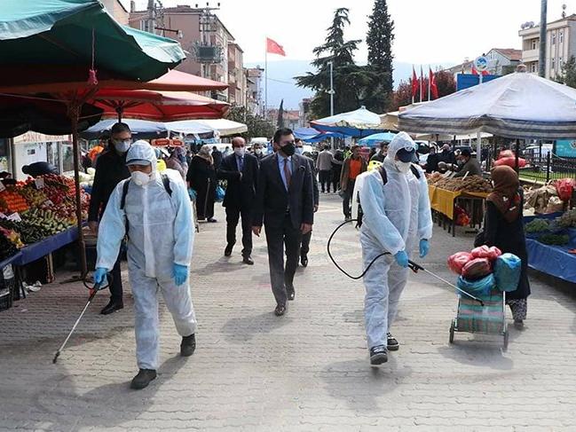 Ancak bu fotoğraflarda dikkat çeken detay ise başkan Güven Övün'ün pazarı gezdiği esnasında önünden giden ve başkanın geçtiği yolları dezenfekte eden ekip oldu.