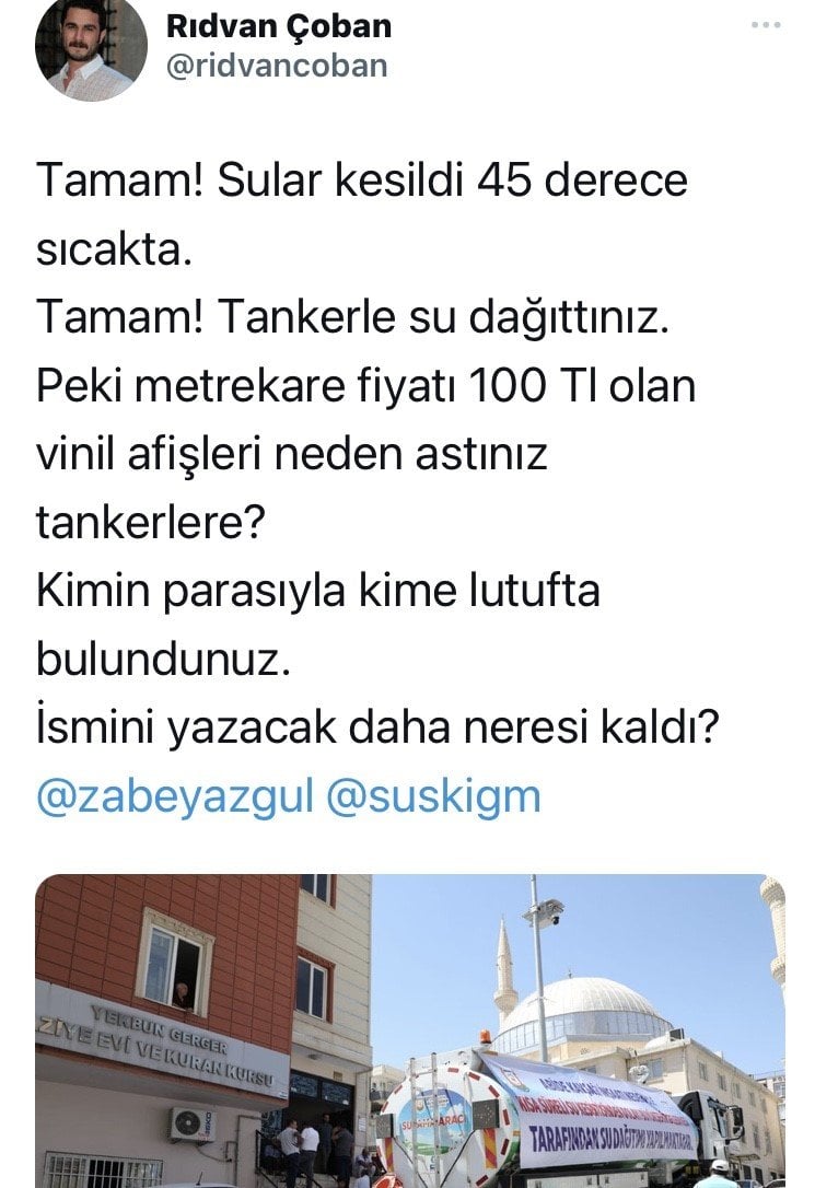 Bir başka kullanıcı ise, “Tamam sular kesildi 45 derece sıcakta. Tamam tankerle su dağıttınız. Peki metrekare fiyatı 100 TL olan vinil afişleri neden tankerlere astınız? Kimin parasıyla kime lütufta bulundunuz? İsim yazacak daha neresi kaldı?" şeklinde tepkisini dile getirdi.