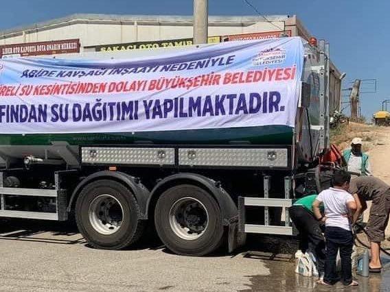 Kadın ve çocuklar ellerindeki bidonlara su doldurup evlerine götürürken, su dağıtımı yapılan tankerlere “Abide Kavşağı İnşaatı nedeniyle kısa süreli su kesintisinden dolayı Büyükşehir Belediyesi tarafından su dağıtımı yapılmaktadır” pankartları asıldı.