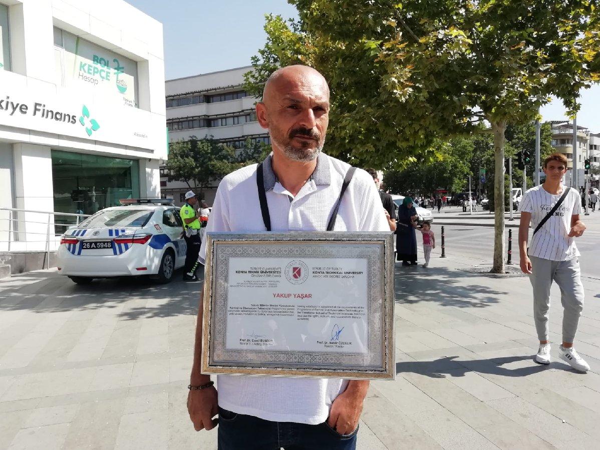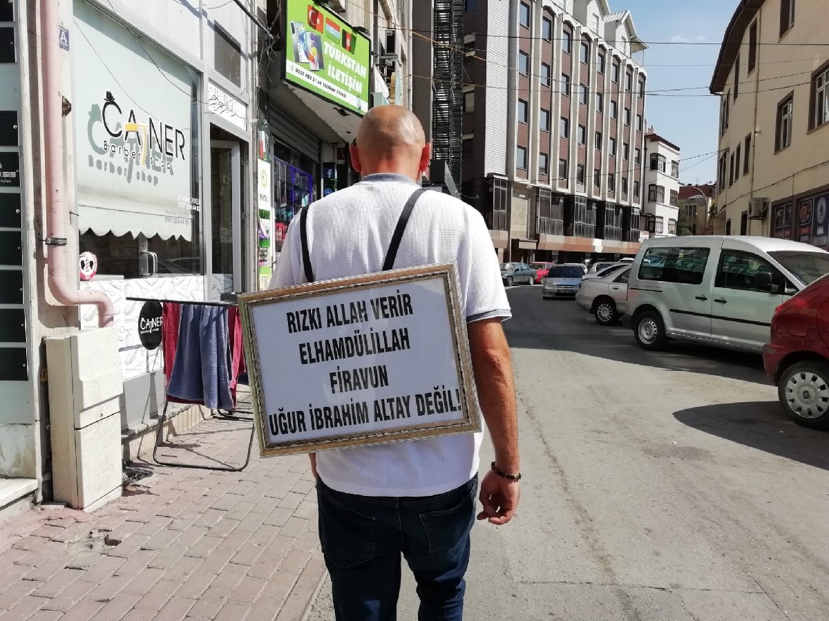 Yaşar, Ön tarafına üniversite diplomasını arka tarafına ise AKP’li Konya Büyükşehir Belediyesi Başkanı Uğur İbrahim Altay’a tepkisini dile getiren “Rızkı Allah verir, Elhamdülillah, Firavun Uğur İbrahim Altay değil” notuyla şehir merkezinde dolaştı.
