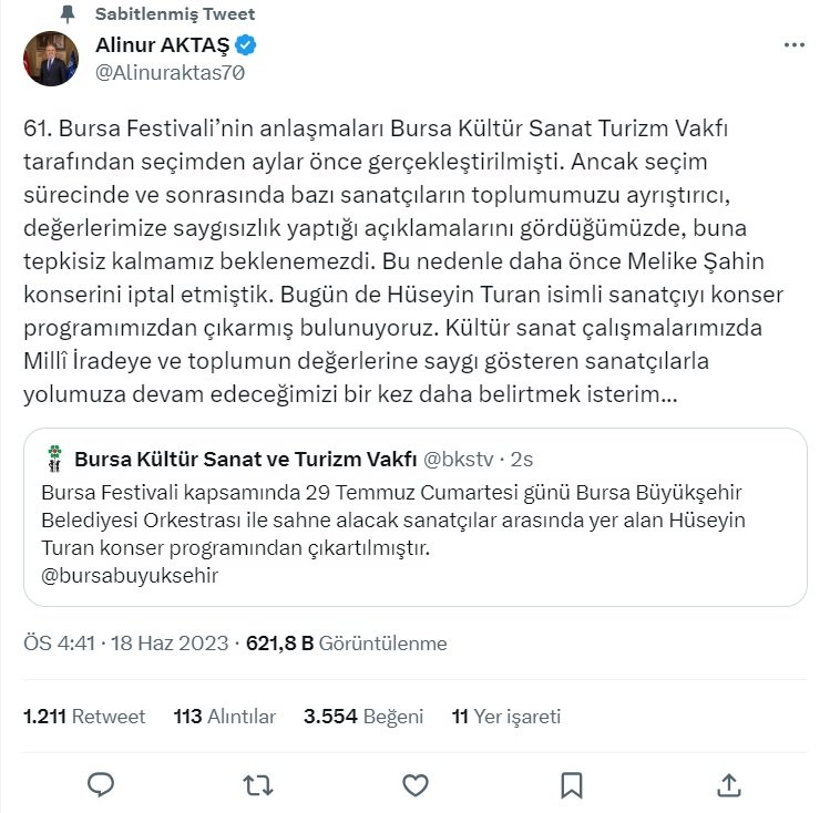 Bu nedenle daha önce Melike Şahin konserini iptal etmiştik. Bugün de Hüseyin Turan isimli sanatçıyı konser programımızdan çıkarmış bulunuyoruz. Kültür sanat çalışmalarımızda Millî İradeye ve toplumun değerlerine saygı gösteren sanatçılarla yolumuza devam edeceğimizi bir kez daha belirtmek isterim...