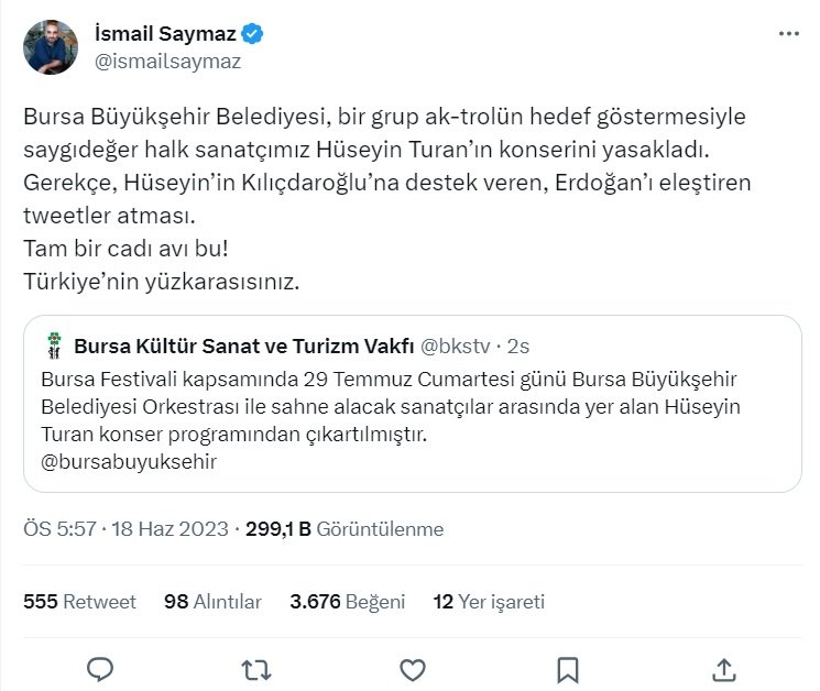 Saymaz, Twitter hesabından yaptığı paylaşımda, “Bursa Büyükşehir Belediyesi, bir grup ak-trolün hedef göstermesiyle saygıdeğer halk sanatçımız Hüseyin Turan’ın konserini yasakladı. Gerekçe, Hüseyin’in Kılıçdaroğlu’na destek veren, Erdoğan’ı eleştiren tweetler atması. Tam bir cadı avı bu! Türkiye’nin yüzkarasısınız.” ifadelerini kullandı.