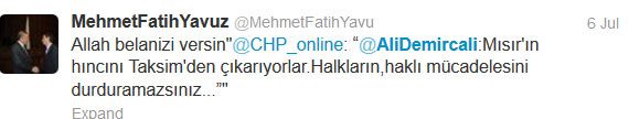CHP Adana Milletvekili Ali Demirçalı, Gezi Parkı'nda müdahalelerin tekrar başladığı cumartesi günü, sosyal paylaşım sitesi Twitter'daki hesabında olaylarla ilgili paylaşımlarda bulundu. 'Gezi Parkı milletindir' diyen Demirçalı, polisin artan müdahalesinin ve satırlı palalı vatandaşların sokağa çıkmasının ardından "Mısır'ın hıncını Taksim'den çıkarıyorlar. Halkların haklı mücadelesini durduramazsınız..." yazdı.