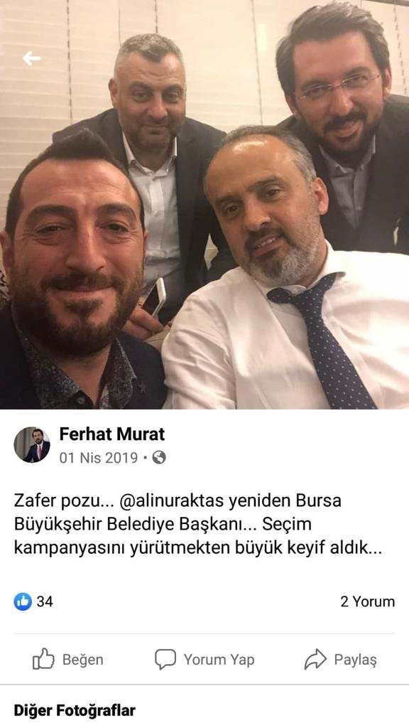 AKP'li Bursa Büyükşehir Belediye Başkanı Alinur Aktaş’ın danışmanı Ferhat Murat, ‘Sorumlu Müdür’ olduğu Sinerji Ltd adlı şirkete, 4 ayda toplam 141 bin 600 TL ödeme yapıldığı iddiaları hakkında yazılı bir açıklama yaptı. Murat, bahse konu şirkette 29 Mayıs 2013 tarihinden bu yana hiçbir hissesinin bulunmadığını savunmuştu.