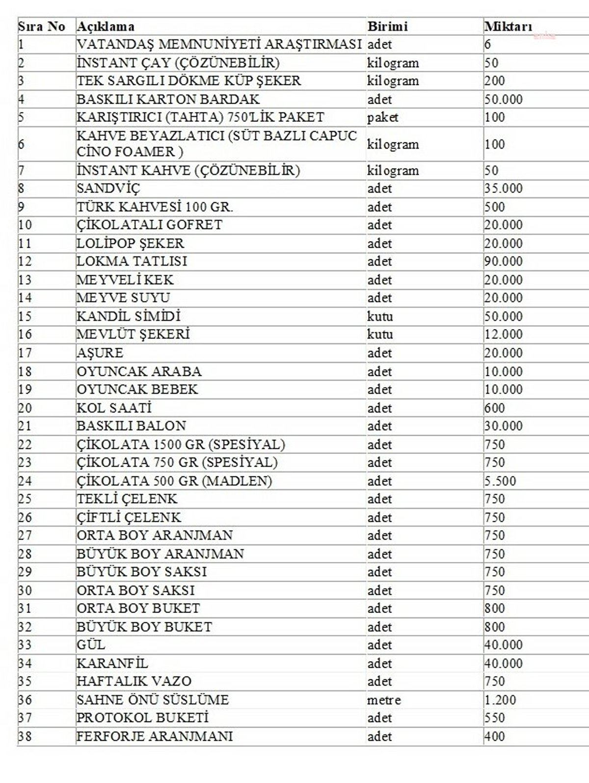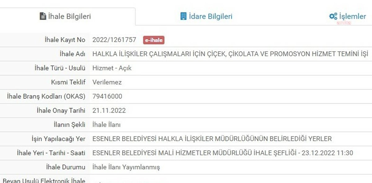 Esenler Belediyesi, 'Halkla ilişkiler çalışmaları için çiçek, çikolata ve promosyon hizmet temin işi' ihalesine çıktı. Vatandaş memnuniyeti araştırması için 6 anket çalışmasının da yürütüleceğinin belirtildiği ihale kapsamında, 38 kalemden oluşan malzeme alımı da yapılacak. Aynı kapsamda 2022 yılında 31 kalem malzeme için ihale yapılmıştı. Geçen yılki ihale dosyasında alınan 10 bin aşure sayısı 20 bine çıkarıldı. Çocuklara dağıtılmak üzere geçen yıl alınan 10 bin oyuncak araba ve oyuncak bebek sayısı ise bu yıl 20 bin oldu.