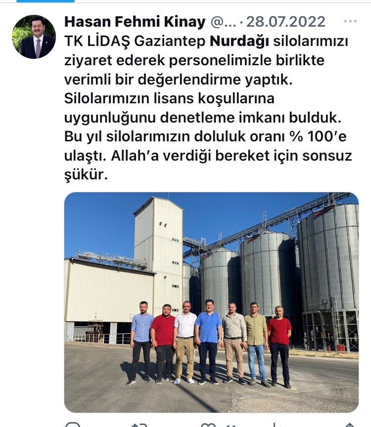 Kinay ziyaret sırasında silolar önünde yetkililerle çekilen fotoğrafı etiketlediği sosyal medya hesabında “TK LİDAŞ Gaziantep Nurdağı silolarını ziyaret ederek personeliyle birlikte verimli bir değerlendirme yaptık. Silolarımızın lisans koşullarına uygunluğunu denetleme imkanı bulduk. Bu yıl silolarımızın doluluk oranı yüzde 100'e ulaştı. Allah’a verdiği bereket için sonsuz şükürler” mesajını paylaşmıştı.