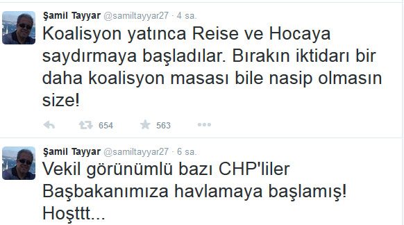 İki liderden koalisyon görüşmeleriyle ilgili açıklamalar yapıldı. Açıklamaların ardından AKP Milletvekili Şamil Tayyar kullandığı sosyal medya hesabından CHP milletvekilleriyle ilgili ağır hakaret içeren tweetler attı.