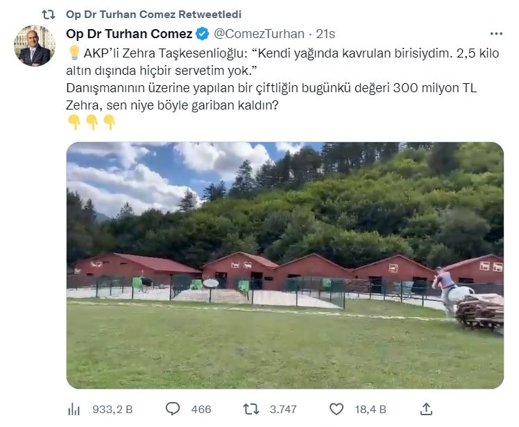 Çömez, başka bir paylaşımda ise “AKP’li Zehra Taşkesenlioğlu, ‘Kendi yağında kavrulan birisiydim. 2,5 kilo altın dışında hiçbir servetim yok.’ Danışmanının üzerine yapılan bir çiftliğin bugünkü değeri 300 milyon TL. Zehra, sen niye böyle gariban kaldın?” diyerek bahse konu çiftliğin videosunu paylaştı.