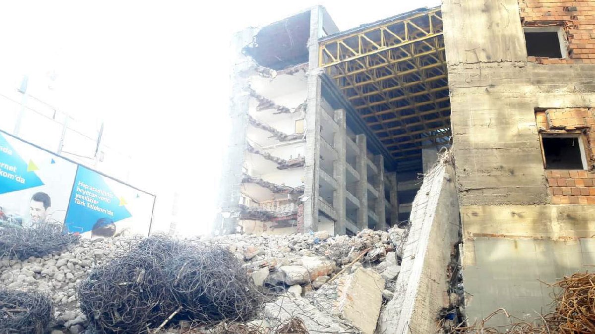 Önce dış cephe sökümü tamamlanan binanın daha sonra betonarme yapısı iş makinalarıyla yıkıldı.