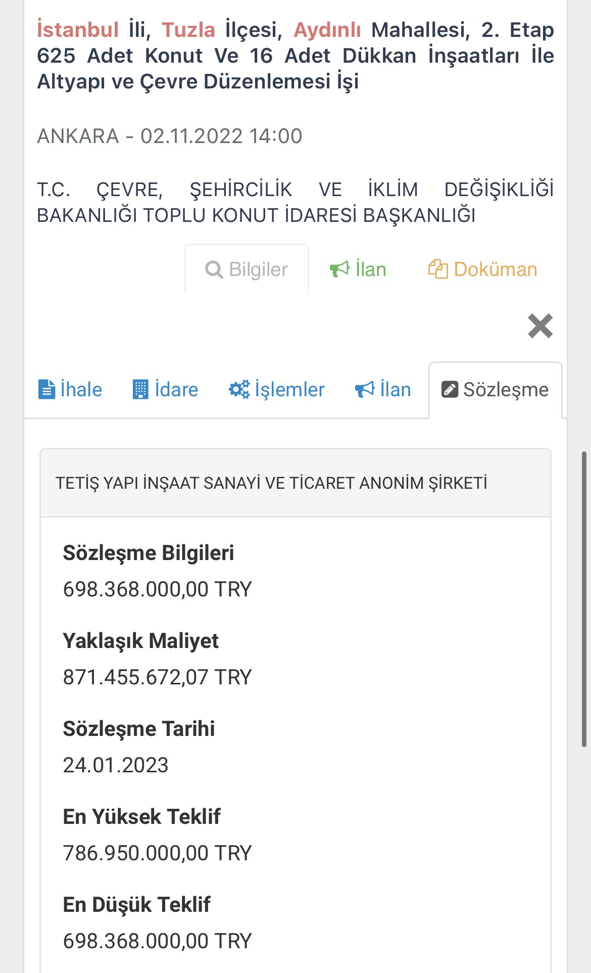İhalesi 2 Kasım 2022 tarihinde yapılan, sözleşmesi 24 Ocak 2023 tarihinde imzalanan ihalenin sonucu, depremden 3 gün sonra 9 Şubat 2023 tarihinde açıklandı. 3 teklifin verildiği ihaleyi Tetiş Yapı İnşaat San. Ve Tic. A.Ş., 698 milyon 368 bin TL’ye aldı.