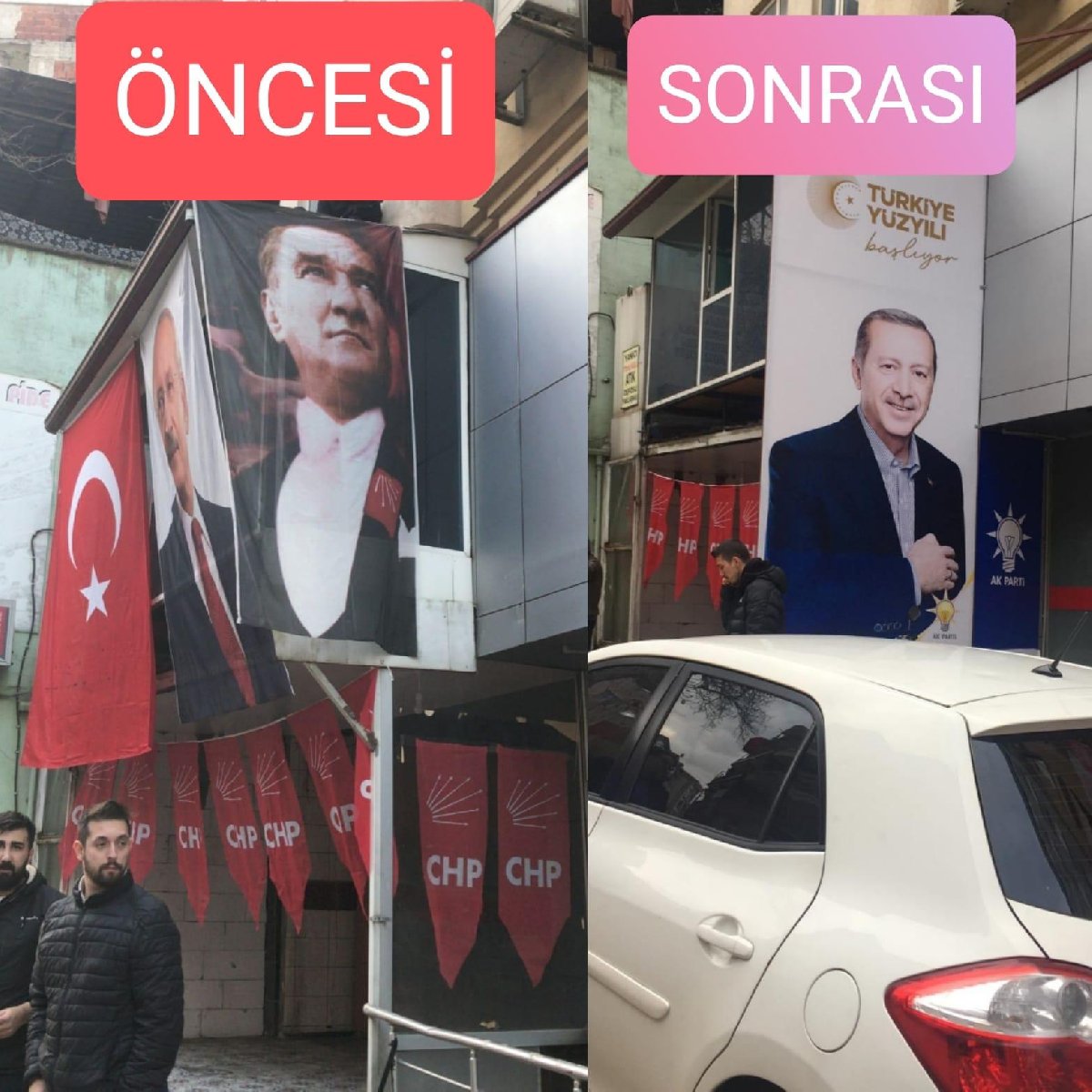 Akıllara durgunluk veren olay Bursa'nın Orhangazi ilçesinde yaşandı. AKP ilçe teşkilatı, parti bayrakları ile donatılan, Atatürk ve Kemal Kılıçdaroğlu posterleri asılan CHP'nin merkez caddedeki seçim bürosunun yanı başındaki boş işyerini kiralayarak Erdoğan posteri astı.