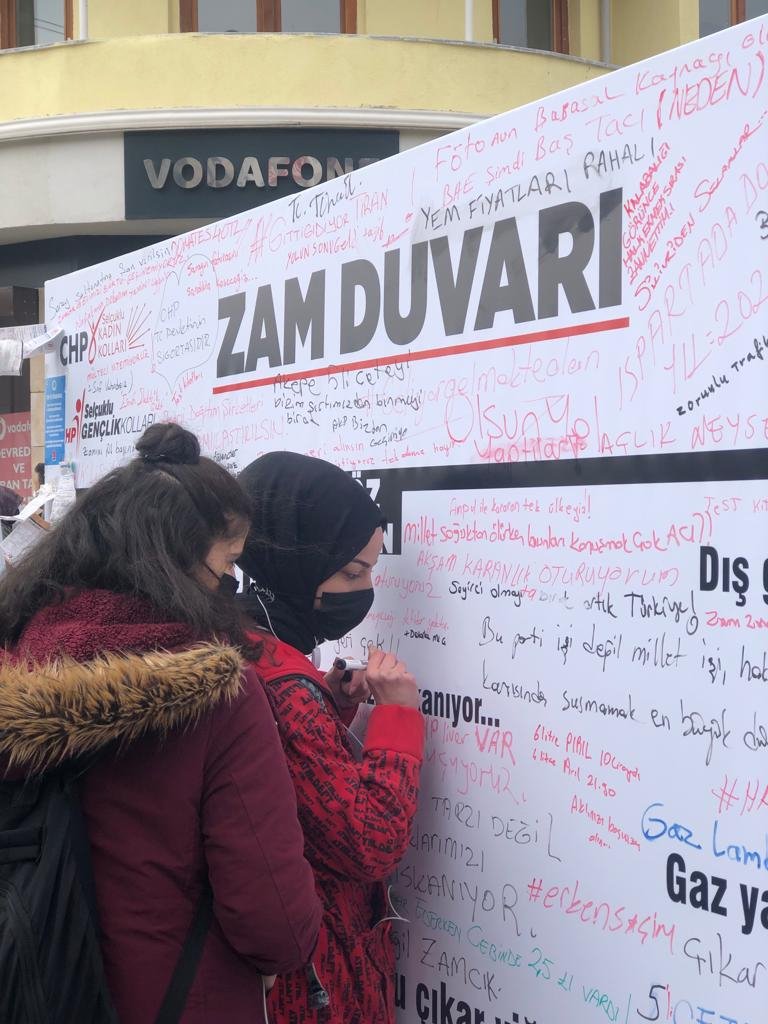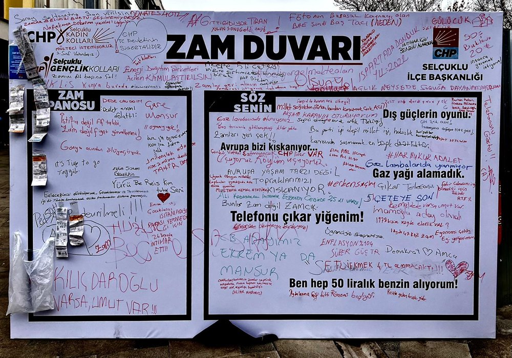 AKP’nin en çok oy aldığı illerin başında gelen Konya’da da CHP Selçuklu İlçe Teşkilatı kentin en işlek alanı olan Zafer Meydanı’na "Zam Duvarı" kampanyası başlattı. Kampanya Konyalıların ilgisi büyük oldu.