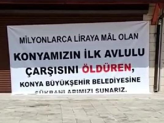 Kapalı dükkânın önüne, üzerinde ‘Milyonlarca liraya mal olan Konya’mızın ilk avlulu çarşısını öldüren Konya Büyükşehir Belediyesi’ne şükranlarımızı sunarız’ yazılı pankartla tepkisini dile getiren esnaf, AKP’li Konya Büyükşehir Belediyesi’nin projede yer alan birçok vaadi yerine getirmediğini ve bu sebeple iş yapamadıklarını söyledi.