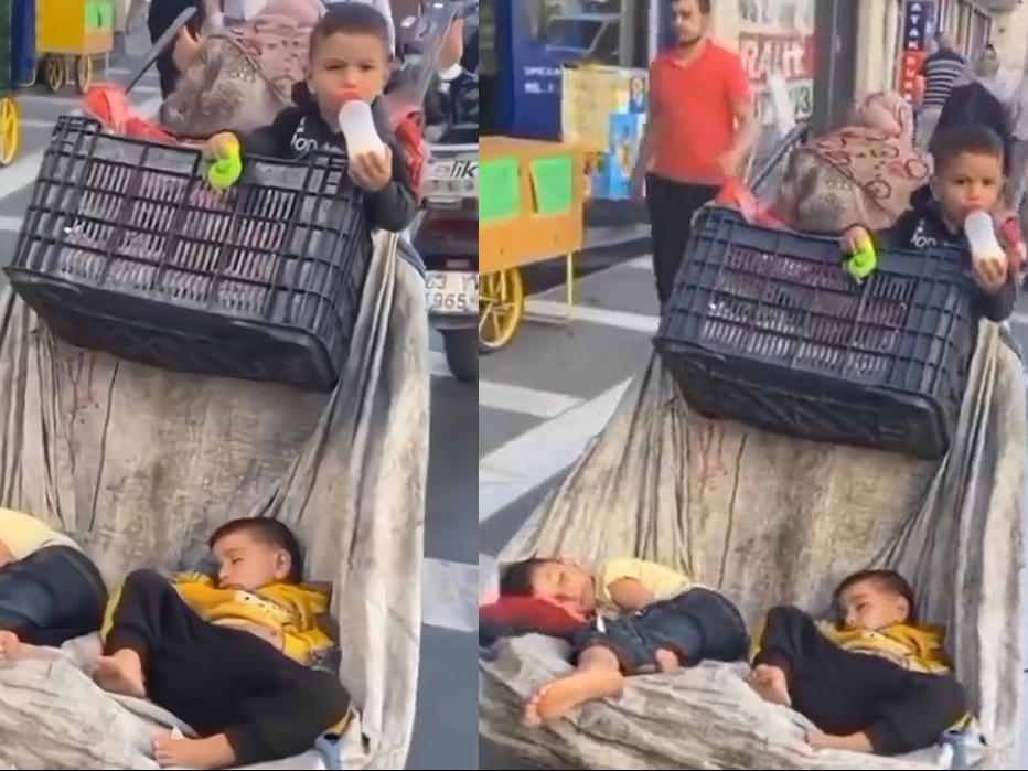 Objektiflere yansıyan görüntüde, kağıt toplayıcısı bir kadının arabasındaki üç çocuğundan ikisi arkada uyuyor. Diğeri ise biberonundaki sütünü yudumluyor.