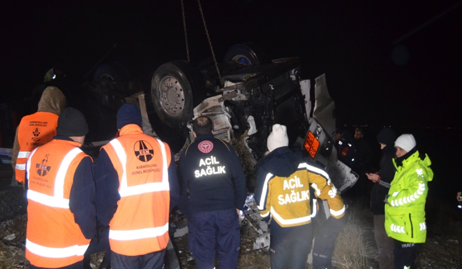 Aksaray-Konya kara yolunun 55’inci kilometresinde gece saat 01.30 sıralarında seyir halinde olan Rıza Er idaresindeki 68 BR 409 plakalı et yüklü tır, sürücüsünün direksiyon hakimiyetini kaybetmesi sonucu savrularak bariyere çarptı. Çarpmanın etkisiyle devrilen tırın kabin bölümü ağır hasar aldı.