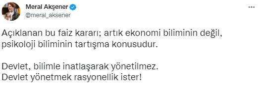 Kararı değerlendiren İYİ Parti Genel Başkanı Meral Akşener, “Açıklanan bu faiz kararı; artık ekonomi biliminin değil, psikoloji biliminin tartışma konusudur. Devlet, bilimle inatlaşarak yönetilmez. Devlet yönetmek rasyonellik ister!” ifadelerini kullandı.