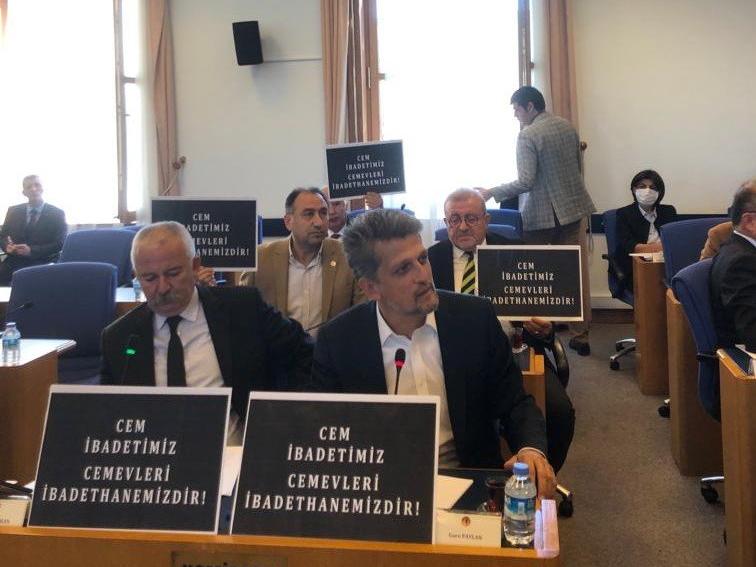 HDP’li vekiller komisyon salonunda “Cem İbadetimiz, Cemevleri İbadethanemizdir” yazılı dövizler açtı.