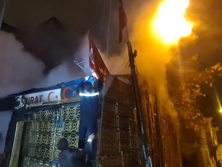 İhbar üzerine olay yerine gelen Erzurum Büyükşehir Belediyesi İtfaiye Daire Başkanlığı ekipleri, kimsenin içinde olmadığı ahşap binaya balta ve kazma kullanarak girip alevlere müdahale etti. Bu sırada tek katlı binanın çatısındaki 2 Türk bayrağını gören ekipler, sepetli itfaiye aracı ile çıkıp ipleri kesti. 2 itfaiye eri, aldıkları Türk bayraklarını indirip muhafaza etti. İçerisinde malzeme bulunan binadaki alevler söndürülürken, polis ekipleri de yangın ile ilgili soruşturma başlattı. (DHA)